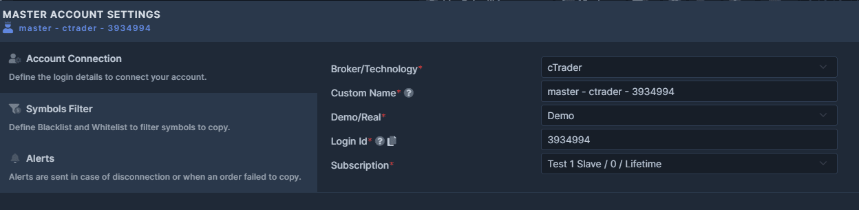 4. You'll be redirected to the cockpit shortly after you add your cTrader account. Don't forget to assign your subscription and verify that the status is "connected". Then you can configure the account or symbol settings for the newly added cTrader account.