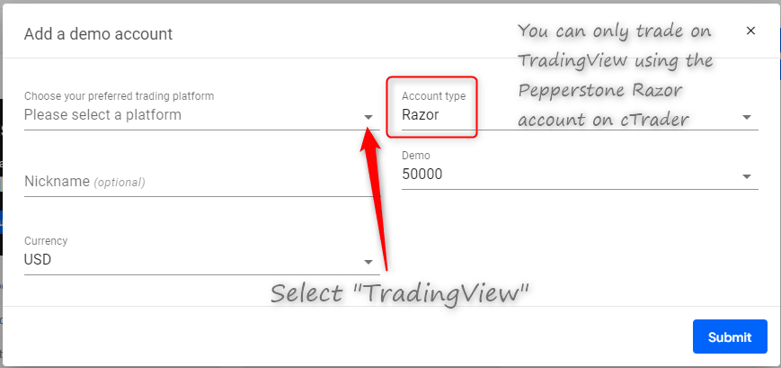 - In the "Choose your preferred trading platform" select TradingView. Fill out the rest of the form according to your preferrence. You can only trade on TradingView using the Pepperstone Razor account on cTrader